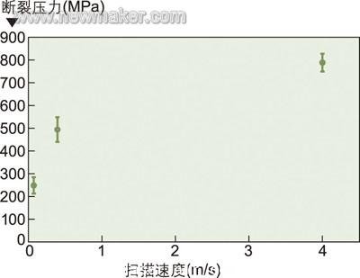 圖3:厚度為50µm的硅晶圓的斷裂壓力隨掃描速度的變化曲線圖。用于切割晶圓的超短脈沖的脈寬為700fs,能量為10μJ,重復(fù)頻率為500kHz。斷裂壓力隨掃描速度的增加而增加。