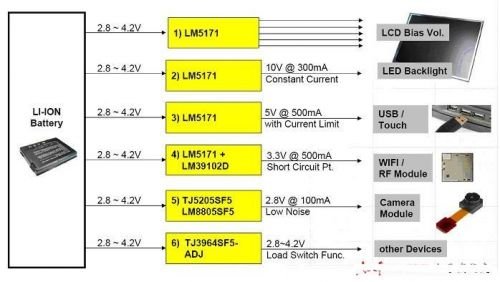 MID (Mobile internet Device) 行動(dòng)因特網(wǎng)裝置,是一個(gè)可以隨時(shí)提供使用者利用Wi-Fi、藍(lán)牙等行動(dòng)通訊來上網(wǎng)的小型化計(jì)算機(jī),讓需要行動(dòng)辦公及隨時(shí)想要享用在線影音服務(wù)者多了一個(gè)選擇。由于MID的體積小型化及電池待命時(shí)間長的要求下,電源管理芯片就必需具備以下幾個(gè)特點(diǎn),第一是外部的組件小并且少,第二是大范圍的負(fù)載變動(dòng)下仍具有高轉(zhuǎn)換效率,第三是具有獨(dú)立控制致能(Enable)的功能,以達(dá)到不同電源的時(shí)序要求,第四是待機(jī)時(shí)的凈秏電量小(Low Standby Current)。以下為益力半導(dǎo)體針對MID所提供之電源管理產(chǎn)品,其特色如下: