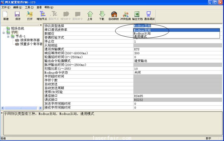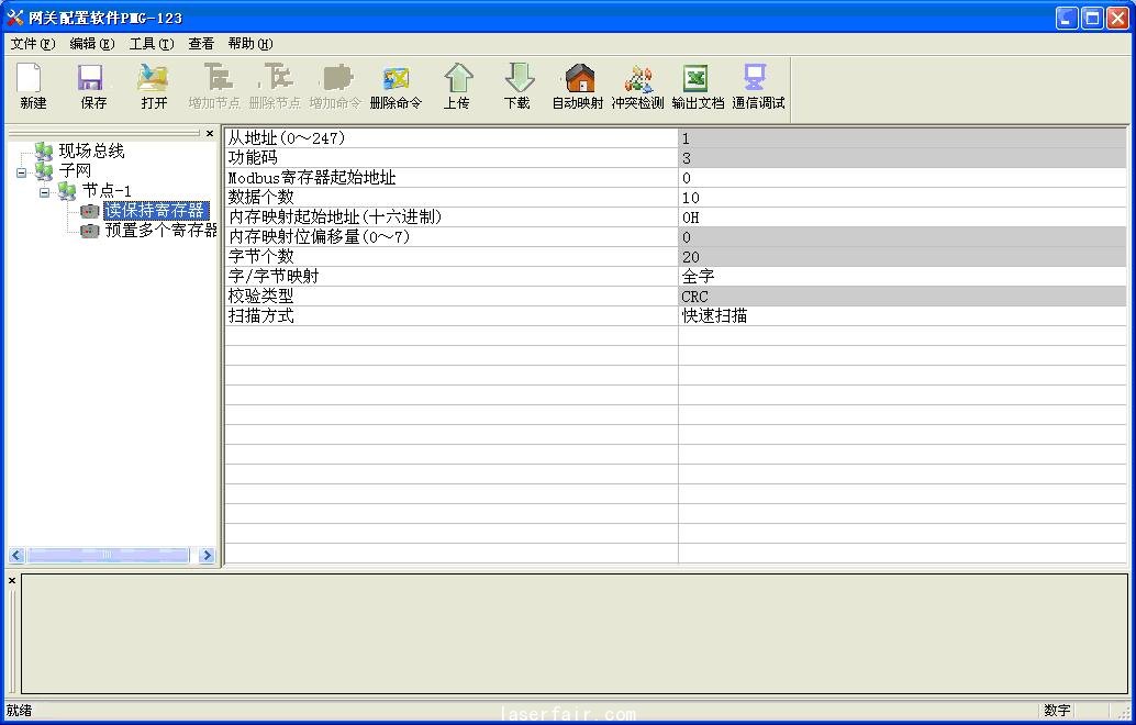其中,圖9中的“節(jié)點(diǎn)-1”表示連接的從站設(shè)備地址為1,配置了“讀保持寄存器”和“預(yù)置多個(gè)寄存器”兩條命令,表示網(wǎng)關(guān)讀取了從站對(duì)應(yīng)地址的數(shù)據(jù),并且能夠輸出數(shù)據(jù)到Modbus從站設(shè)備,命令配置方法如下: