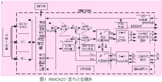 IRMCK201是基于數(shù)字同步旋轉矢量控制的交流伺服驅動的單片硬件解決方案。圖1所示為其基本功能模塊。