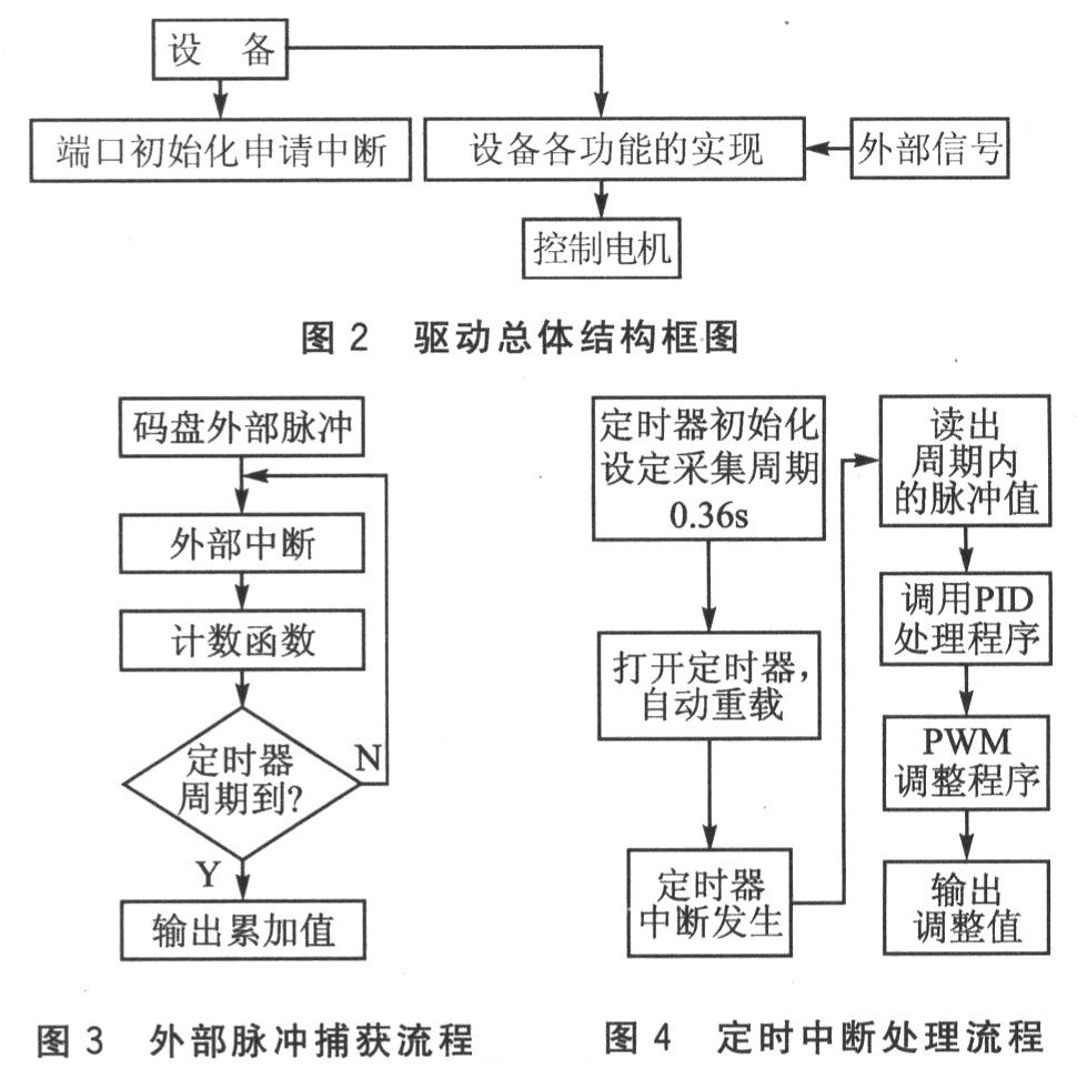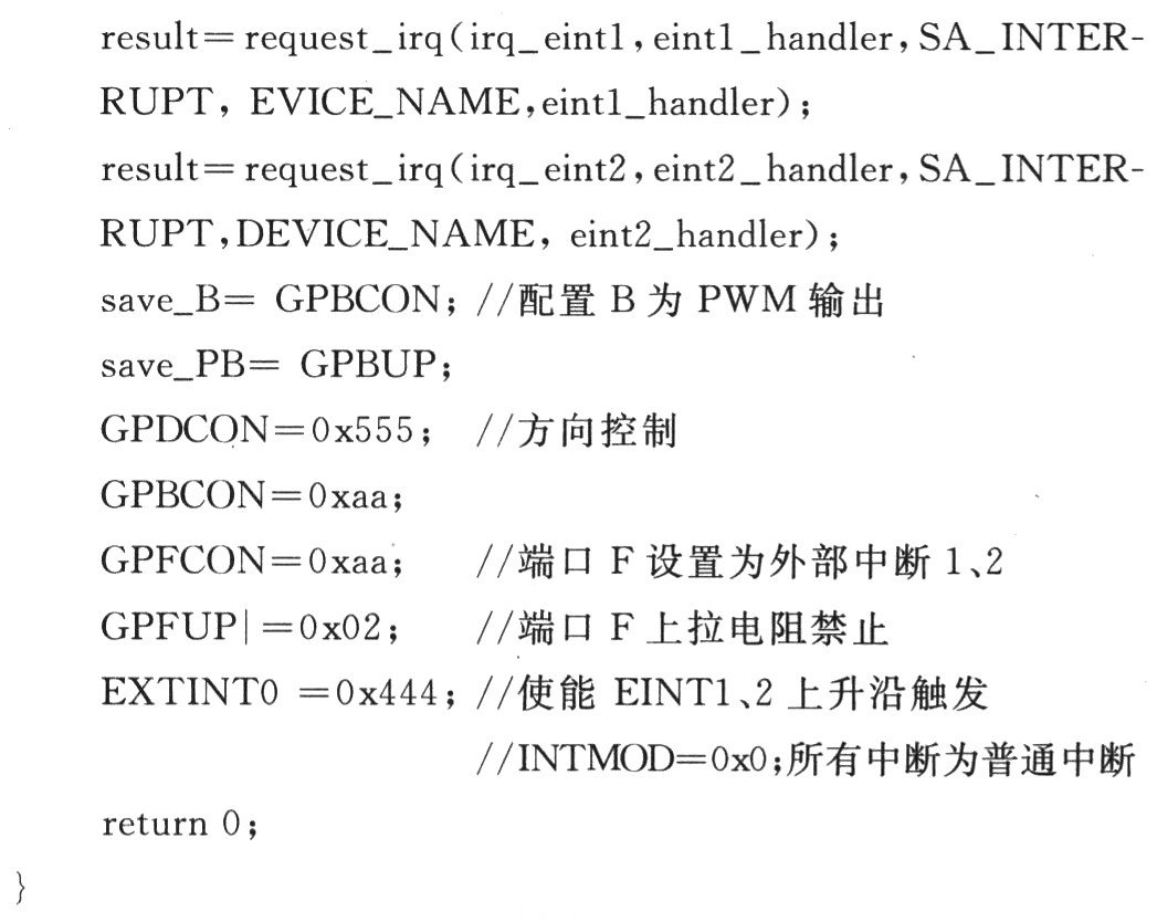 ARM沒有捕獲外部脈沖的計(jì)數(shù)器,它的定時(shí)器是用來(lái)計(jì)算內(nèi)部脈沖的。碼盤輸出信號(hào)接外部中斷處理程序(EINTl)并設(shè)置上沿觸發(fā)變量,在中斷中設(shè)置一全局變量i,用i++累加。設(shè)置定時(shí)器timer0,使它O.36 s產(chǎn)生1次內(nèi)部定時(shí)器中斷。當(dāng)一個(gè)定時(shí)器周期完成時(shí)引發(fā)定時(shí)器中斷,在timer0中斷中讀出i的值,即得到O.36 s內(nèi)碼盤轉(zhuǎn)動(dòng)所產(chǎn)生的脈沖數(shù);接著將i清零,為下一個(gè)定時(shí)器周期捕獲脈沖作準(zhǔn)備。