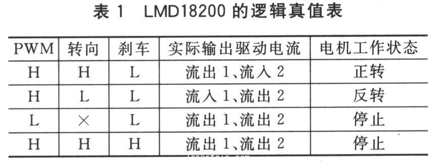本設(shè)計(jì)采用的LMD18200的真值表如表1所列。通過(guò)ARM的I/0口(例如D口的DO~3)來(lái)控制電機(jī)的工作狀態(tài)。