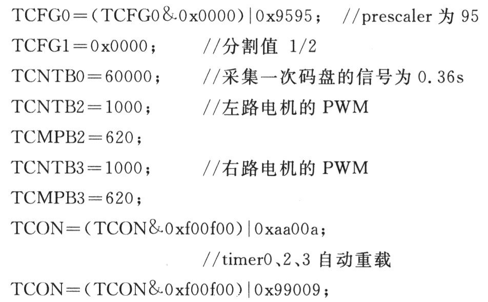 以下所有的函數(shù)都是在ioctl()中實(shí)現(xiàn)的。在Dcmo-tor_STart里調(diào)用timer0_2_3_start(),設(shè)置timer0為接收兩路電機(jī)的碼盤信號(hào),并檢測(cè)電機(jī)速度;timer2、timer3提供2路PWM輸出,并設(shè)置定時(shí)器自動(dòng)重載。具體實(shí)現(xiàn)如下: