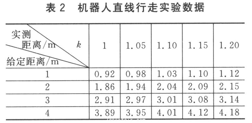 智能機(jī)器人選用的光碼盤精度為256線,即256脈沖/轉(zhuǎn)。電機(jī)減速比為1:71,車輪半徑R為6 CM,車輪間距為41.1 cm.車輪轉(zhuǎn)一圈所產(chǎn)生的脈沖數(shù)n=71×256=18 176,可以得到每個(gè)脈沖之間的距離d=27πR/n=2×3.14×0.06/18 176=0.207×10-4m,即每個(gè)脈沖對(duì)應(yīng)的控制精度達(dá)0.02 mm.考慮到負(fù)載變化的影響,理論值與實(shí)際值會(huì)出現(xiàn)誤差,因此在控制精度d前乘以一個(gè)修正系數(shù)k.表2為機(jī)器人直線行走的實(shí)驗(yàn)數(shù)據(jù)。可以看出,k為1.10誤差較小,最接近真實(shí)值,因此該值就是所需的比例系數(shù)。