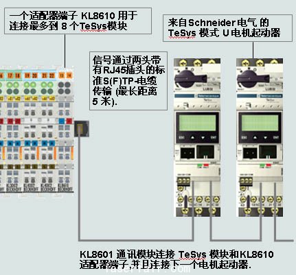 KL8601 通訊模塊連接 TeSys 模塊到總線端子系統(tǒng), 因此使得它們現(xiàn)場總線能力適合所有通用系統(tǒng)