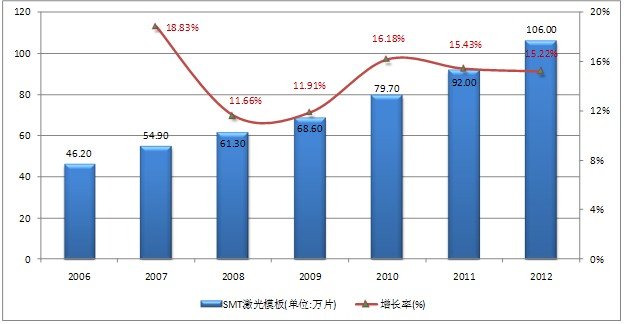 首先,我們先討論激光漏印模板中的SMT激光模板,下表是2006~2012年中國SMT激光模板的市場容量估計圖: