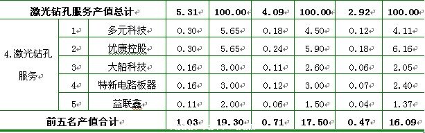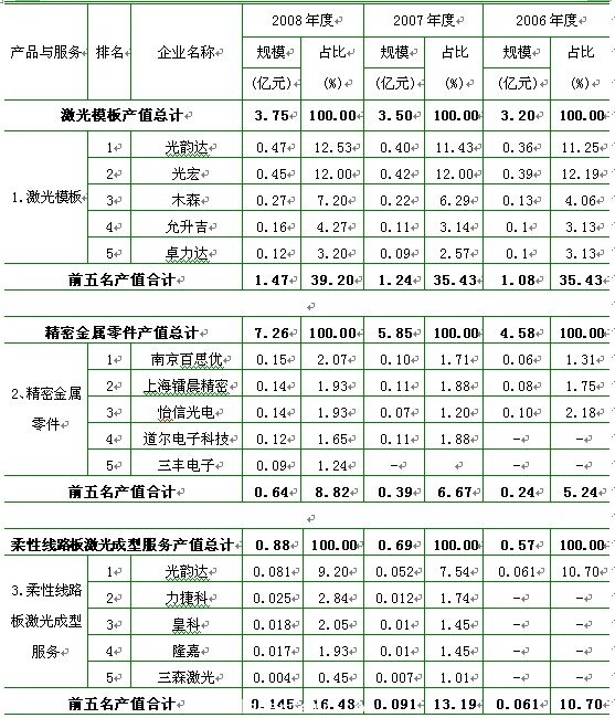 近三年國內(nèi)激光模板、精密金屬零件、柔性線路板精密激光成型服務(wù)和精密激光鉆孔服務(wù)的市場份額排名前5位的廠家。