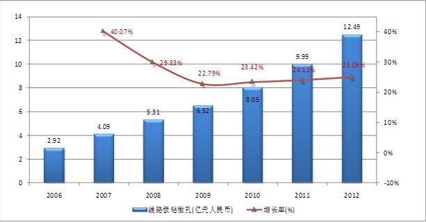 CPCA(中國印刷電路行業(yè)協(xié)會)統(tǒng)計,2006年至2008年國內(nèi)HDI市場成長速度達(dá)30%以上,2006年中國HDI使用面積達(dá)到285萬平方米。根據(jù)HDI平均每平方米232500孔,每千孔加工價格0.80元,外包比例55%測算,2006HDI鉆孔外包市場規(guī)模達(dá)到2.92億元,2007年增長40%,達(dá)到4.09億元,2008年增長30%,市場規(guī)模為5.31億元。預(yù)計2009年市場規(guī)模為6.52億元,至2012年市場規(guī)模為12.49億元。以下是中國線路板鉆微孔的市場容量預(yù)測: