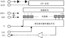 以傳真機(jī)為例,傳真機(jī)與CIS的接口形式如表所示,傳真機(jī)給CIS提供工作電源VDD和VSS、時(shí)鐘CLK、選通信號(hào)SI、光源電壓VLED和GLED,CIS向傳真機(jī)輸出載有圖像信息的模擬信號(hào)SIG。