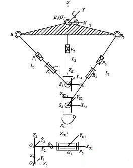 設(shè)定L2分支中繞X 軸旋轉(zhuǎn)虎克鉸的旋轉(zhuǎn)角度為α,繞Y軸旋轉(zhuǎn)虎克鉸的旋轉(zhuǎn)角度為β,3個分支的桿長分別為L1、L2、L3,串聯(lián)關(guān)節(jié)回轉(zhuǎn)轉(zhuǎn)動副和俯仰轉(zhuǎn)動副的轉(zhuǎn)角分別為γ和θ ,則由位姿坐標(biāo)變換可得到: