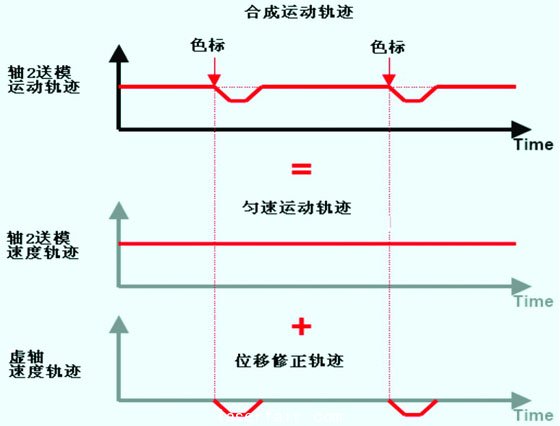 虛軸是運(yùn)動(dòng)控制器內(nèi)部可以創(chuàng)建的一個(gè)假想軸,專門用于位移量疊加計(jì)算進(jìn)行使用,由于是理想軸,所以不會出現(xiàn)任何偏差,并且可以自己定義任何軌跡圖,因此,如果沒有偏差的話,軸2就以勻速運(yùn)動(dòng)進(jìn)行運(yùn)動(dòng),那么系統(tǒng)運(yùn)行非常平穩(wěn),而且主軸的位移量偏差的疊加可以作為一個(gè)獨(dú)立的程序段,即使膜長和色標(biāo)寬度改變,也只需要對虛軸部分程序段進(jìn)行修改,增強(qiáng)程序擴(kuò)展性;
