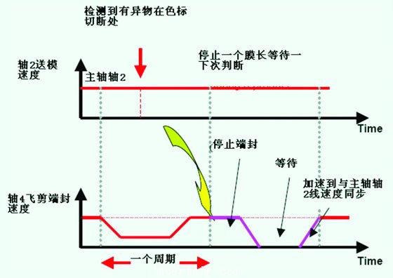 飛剪端封軸完成一次端封準(zhǔn)備切斷時(shí),立刻通過外部傳感器3檢測色標(biāo)處是否有異物,如果有異物,端封軸停止進(jìn)入等待狀態(tài),送膜軸自動(dòng)送出一個(gè)膜長,直到下一個(gè)色標(biāo)處進(jìn)行檢測,如果沒有異物,則端封軸恢復(fù)端封;