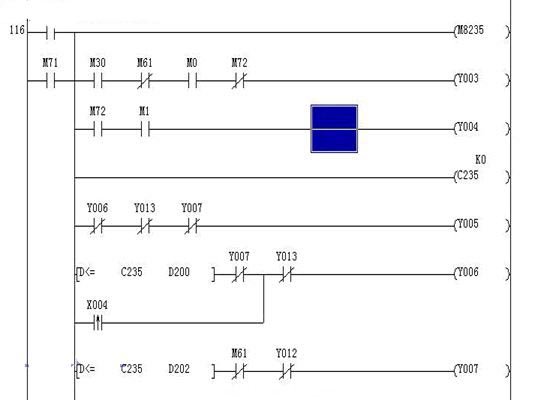 編程中其它應(yīng)注意的問(wèn)題。一是雙線圈問(wèn)題。本工程中利用條件跳轉(zhuǎn)和步進(jìn)指令避免了雙線圈問(wèn)題。二是誤信號(hào)問(wèn)題。編碼器是一種比較精密的光電產(chǎn)品,受振動(dòng)時(shí)不可避免的會(huì)出現(xiàn)誤信號(hào),而切紙機(jī)在執(zhí)行裁切動(dòng)作時(shí)會(huì)造成很大振動(dòng),如果忽視這個(gè)現(xiàn)象,定位精度和執(zhí)行機(jī)構(gòu)當(dāng)前位置的顯示都會(huì)不準(zhǔn)確。本工程中處理方法參見(jiàn)上面例子程序圖1,只有Y3、Y4接通,即只有進(jìn)給機(jī)構(gòu)前進(jìn)和后退時(shí)才讓C236進(jìn)行計(jì)數(shù),這樣就屏蔽了裁切時(shí)震動(dòng)造成的誤信號(hào)。