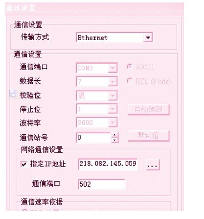 (1)在pc2上打開wpl軟件,在通訊設(shè)置中,選擇“ethernet”,選擇指定ip為adsl的ip地址:218.82.145.059。如果該ip地址下連接了多臺設(shè)備(rs485),則可通過圖8中的通訊站號來區(qū)分??蓪崿F(xiàn)分別對各臺設(shè)備進行監(jiān)控操作。