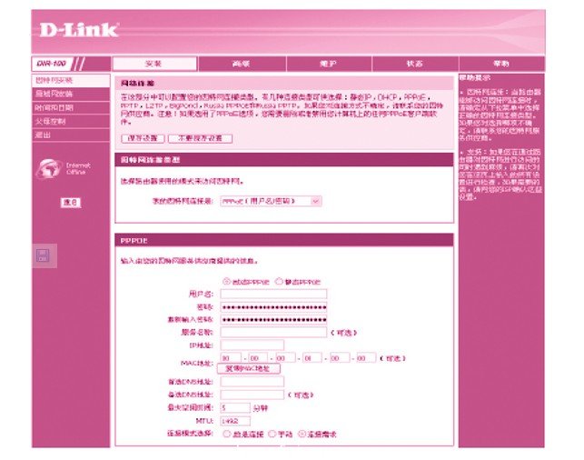 (6)登錄后,進入“安裝向?qū)?rdquo;,選擇互聯(lián)網(wǎng)連接方式為動態(tài)pppoe(dsl),輸入用戶名和密碼(即為向電信申請的賬戶密碼),選擇連接模式為總是連接,然后“保存設(shè)置”,這樣就實現(xiàn)了路由器自動撥號登錄上網(wǎng),而無需手動撥號。這也為后續(xù)en01-sl的聯(lián)網(wǎng)提供了基礎(chǔ)。如圖4所示。
