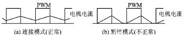 設(shè)計選用150 W MAXON RE40電機(jī)。在12 V輸入下,無負(fù)載的速度是6 920 r/s。最大連續(xù)電流是6 A。PWM時基信號對電機(jī)噪聲有很大的影響(因為人耳一般能聽到的聲波的頻率范圍是20 Hz~20 kHz),同時影響電機(jī)的表現(xiàn)性能。要防止整個周期中電流過零(就是通常所說的不連續(xù)的電流狀態(tài),當(dāng)電機(jī)輕載時),如圖5(b)所示。這種不連續(xù)電流會導(dǎo)致扭矩轉(zhuǎn)速曲線非常陡,在電機(jī)中將產(chǎn)生某種脈沖,使電機(jī)轉(zhuǎn)子產(chǎn)生更大的噪聲,本電路使用MAXON電機(jī),就是為了獲得連續(xù)的電流模式,所選擇的PWM脈沖頻率是8 kHz。