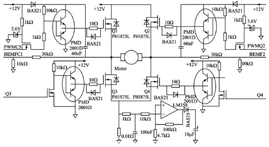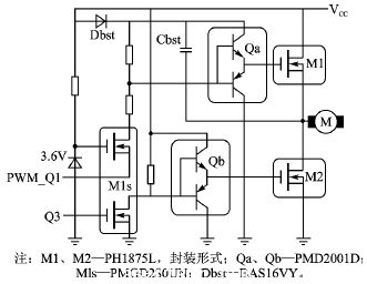 MOSFET驅(qū)動提升了控制器輸出信號驅(qū)動電機(jī)的能力。本設(shè)計選擇NXP芯片PMD2001D和PMGD280UN,如圖7所示。