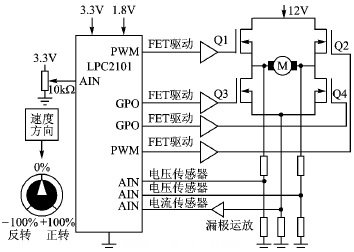 速度和電機(jī)的扭矩大小是依據(jù)電機(jī)旋轉(zhuǎn)產(chǎn)生的磁場強(qiáng)度來控制的,而電機(jī)的旋轉(zhuǎn)能量是依賴于通過電流大小來控制的,因此調(diào)整電機(jī)轉(zhuǎn)子的電壓和電流可以改變電機(jī)的速度。本電機(jī)速度的控制是根據(jù)LPC2101微控制器的PWM信號的變化而產(chǎn)生的。