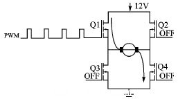 驅(qū)動有刷直流電機(jī)的雙向旋轉(zhuǎn),可通過全橋驅(qū)動電路改變電流來實現(xiàn)完成,如圖2所示。這個全橋驅(qū)動電路由N通道的MOSFET管組成,當(dāng)Q2和Q3關(guān)閉的時候,Q1和Q4導(dǎo)通電機(jī)正相旋轉(zhuǎn);當(dāng)Q1和Q4關(guān)閉時,Q2和Q3導(dǎo)通電機(jī)反相旋轉(zhuǎn)。