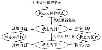 軟件部分采用C語言編寫,使用Keil μVision(ARM7 RealView V3.0)開發(fā)環(huán)境。主函數(shù)實現(xiàn)如下功能:讀取電位器數(shù)值來調(diào)整速度和電機(jī)方向;讀取電機(jī)反電動勢電流;設(shè)定PWM占空比和控制Q1~Q4 MOSFET輸出;執(zhí)行RS232通信。圖11表示控制系統(tǒng)流程。使用 RS232接口每200 ms給PC端計算機(jī)發(fā)送電機(jī)速度和電流、電壓信息。電機(jī)控制軟件部分狀態(tài)機(jī)如圖12所示。狀態(tài)處理是在主程序循環(huán)中處理的,LPC2101的定時器2用于產(chǎn)生PWM信號。在每個PWM信號中斷子程序進(jìn)入后,可以通過改變占空比來調(diào)整既定電機(jī)速度并設(shè)置MOSFET輸出控制 Q1~Q4。定時器0用于10 ms的系統(tǒng)定時。