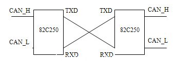 該方案就是在總線線路中直接加入兩個發(fā)送芯片(采用82C250為例)[3],并把發(fā)送芯片的管腳TXD和RXD對連。其連接電路如下: