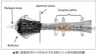 如圖1所示使用鹵素燈建構(gòu)光學系統(tǒng)時,大多利用橢圓形反射鏡將光線集中至開口處投影。發(fā)光二極管的場合,單位發(fā)光二極管的光束很少,當作照明光源使用時必須使用數(shù)個~數(shù)十個發(fā)光二極管,因此復數(shù)光源產(chǎn)生的光線控制非常重要。
