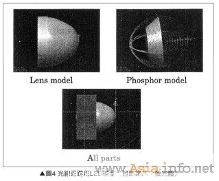 上述大型照明燈具,光學組件接近光源設(shè)置的場合,必須考慮發(fā)光二極管內(nèi)部結(jié)構(gòu)模型化。模型化首先量測發(fā)光二極管的形狀與熒光體的尺寸。鏡片形狀的模型化使用式(1)非球面方程式,以最小自乘法進行與量測值的優(yōu)化(Fitting)。發(fā)光部位則進行熒光體發(fā)光的模型化,各部位的發(fā)光強度則與激發(fā)強度呈比例。