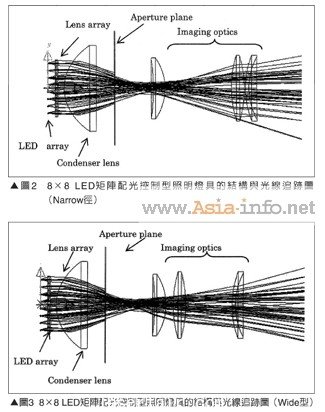 復數(shù)LED當作配配光控制型照明燈具使用時,必須結(jié)合高功率發(fā)光二極管與光學系統(tǒng),利用鏡片數(shù)組(Array)將發(fā)光二極管產(chǎn)生的光線準直化(Collimate),接著再透過聚光鏡片(Condenser Lens)使光線在開口處混合集光,最后再利用成像光學系統(tǒng)使該開口光源影像變倍投影,進行所謂的“配光控制”。此外使用鏡片數(shù)組與聚光鏡,還可以消除照射面的亮度不均與色不均等問題。
