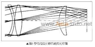 一般大型照明燈具,例如變倍投影的照明燈具大多采用2群2片成像鏡片設(shè)計(jì),很少設(shè)置收差補(bǔ)正鏡片。新型大型照明燈具使用的鏡片,采用很重視成像特性的鏡片系統(tǒng),同時(shí)針對發(fā)光二極管與鹵素?zé)粽彰鳠艟叩牟町慄c(diǎn),例如分光強(qiáng)度與開口口徑進(jìn)行確認(rèn)。成像鏡片采用3群3片全長固定型變倍鏡片(Zoom Lens)設(shè)計(jì),可在100~150mm焦點(diǎn)范圍進(jìn)行變倍投影,圖8是變倍成像光學(xué)系統(tǒng)與光線圖。