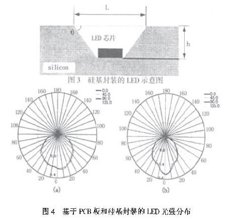 MEMS技術(shù)是隨著半導(dǎo)體和微電子技術(shù)的發(fā)展麗發(fā)展起來的一項新興的細(xì)微加工技術(shù),加工尺寸從毫米到微米數(shù)量級,甚至亞微米的微小尺寸:其加T藝主要分為表面工藝和體工藝?;诠杌捏w工藝又稱為體硅工藝,體硅工藝呵以在硅基體上形成高深寬比的凹稽。由于MEMS的加工尺寸很小,因此利用該技術(shù)形成的微小凹槽作為LED芯片封裝的反射腔(如圖3),將會克服目前LED芯片直接封裝在PCB板上而引起發(fā)光效率低的問題;同時由于硅具有良好的導(dǎo)熱特性,因此可以降低目前封裝中熱阻高的問題,從而提高LED芯片的發(fā)光效率和可靠性。圖4(a)和(b)給出了當(dāng)LED芯片直接貼裝在PCB板上和貼裝在有凹槽的硅基上的發(fā)光特性。從圈中可以看出,LED貼裝在帶有凹槽的硅基上以后其發(fā)出光的發(fā)散性能得到了很大的改善,LED的發(fā)光強(qiáng)度提高了75%以上。