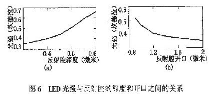 圖6(a)和(b)分別給出了反射腔的深度h和開口L與LED光強(qiáng)的關(guān)系,從圖中可得,反射腔的深度越深,光強(qiáng)越大;開12t越小,光強(qiáng)越火。但是在反射角確定的情況一F,深度和開r_l的寬度是相互制約的。當(dāng)深度一定的時候,開口越小,則槽的底部會越小、,而槽的底部受芯片尺寸的約束。因此開口有一個極限最小值。隅理,當(dāng)開幾一定的時候,深度越深,底部幾寸越小,罔此深度有一個檄大值,所以在設(shè)計槽的K寸的時候應(yīng)該結(jié)合芯片的尺寸進(jìn)行綜合考慮。本文中所采用的芯片尺寸為0 4x0 4 x 0 15mm。