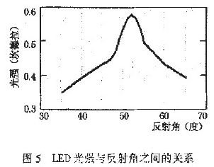 圖5為LED發(fā)射光與反射的反射角θ之間的關(guān)系,從圖中可看出當(dāng)反射角為52度的時候反射光強(qiáng)取得最大。從理論上講,硅凹槽反射角應(yīng)該設(shè)計為52度。但是,考慮到對(100)硅進(jìn)行腐蝕的時候,其(111)面和(100)面會自動形成一個54.7度的角,而通過仿真分析結(jié)果可以計算。當(dāng)反射角為54.7度的時候。LED的反射光強(qiáng)只比反射角為52度的時候小12%,而且光強(qiáng)分布也比較接近。因此在腐蝕凹槽的時候可以直接采用硅的(100)面和(111)面形成角度作為反射角,這可以極大的簡化加工工藝,降低制造成本,而且對LED光強(qiáng)的影響也不是很大。