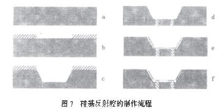 基于MEMS的LED芯片封裝主要包括兩個大的部分,第一個部分是加工帶有反射腔的硅基體;第二部分是LED芯片的貼片、引線等通用工藝。由于該封裝結(jié)構(gòu)的第二個部分和標(biāo)準(zhǔn)的LED封裝工藝相同,因此本文卡要詳細(xì)的介紹第一部分的主要工藝流程(如圖7)。