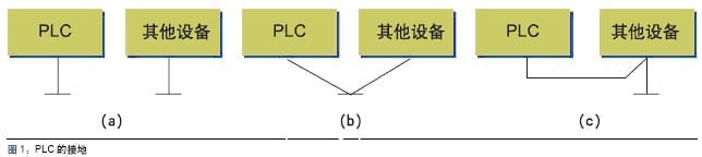 PLC本身的抗干擾能力一般都很強。通常,只能將PLC的電源與系統(tǒng)的動力設(shè)備電源分開配線,對于電源線來的干擾,一般都有足夠強的抑制能力。但是,如果遇上特殊情況,電源干擾特別嚴重,可加接一個帶屏蔽層的隔離變壓器以減少設(shè)備與地之間的干擾,提高系統(tǒng)的可靠性。如果一個系統(tǒng)中含有擴展單元,則其電源必須與基本單元共用一個開關(guān)控制,也就是說,它們的上電與斷電必須同時進行。良好的接地是保證PLC安全可靠運行的重要條件。為了抑制附加在電源及輸入端、輸出端的干擾,應(yīng)給PLC接專用地線,并且接地點要與其它設(shè)備分開,如圖1(a)。若達不到這種要求,也可采用公共接地方式,如圖1(b)。但是禁止采用串聯(lián)接地方式,如圖1(c),因為它會使各設(shè)備間產(chǎn)生電位差而引入干擾。此外,接地線要足夠粗,接地電阻要小,接地點應(yīng)盡可能靠近PLC 。