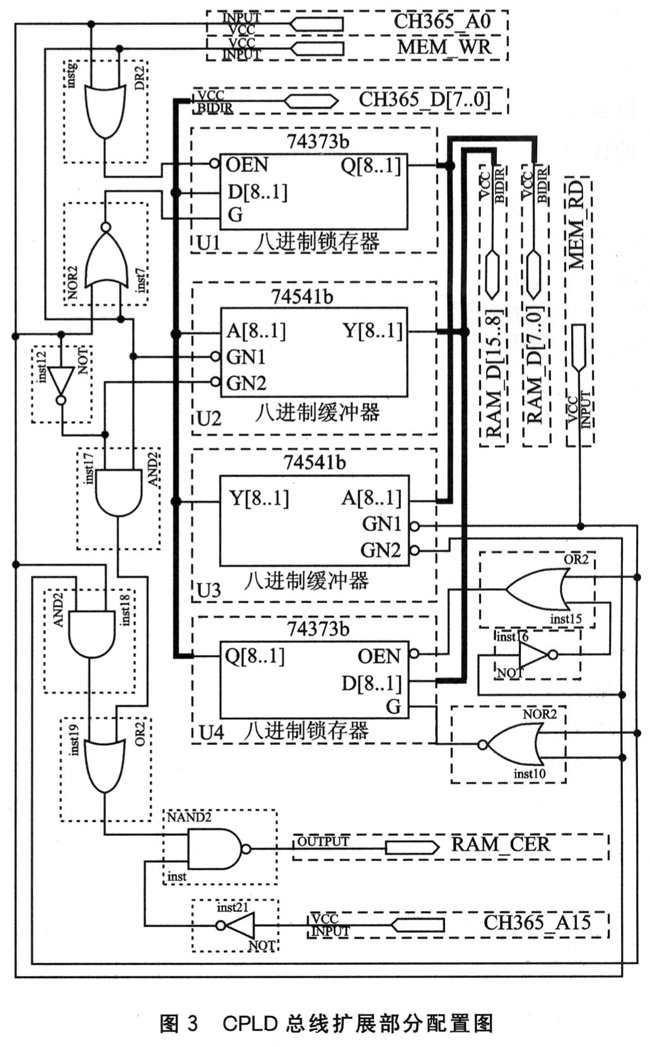 CPLD芯片選用A1tera公司生產(chǎn)的EPM7064,通過(guò)CH365地址線(xiàn)A0的使能對(duì)16位數(shù)據(jù)進(jìn)行分時(shí)讀/寫(xiě),從而解決了數(shù)據(jù)總線(xiàn)的擴(kuò)展問(wèn)題。其內(nèi)部邏輯電路如圖3所示,其中主要包括2個(gè)鎖存器(74373b),和2個(gè)三態(tài)門(mén)緩沖器(74541b)。