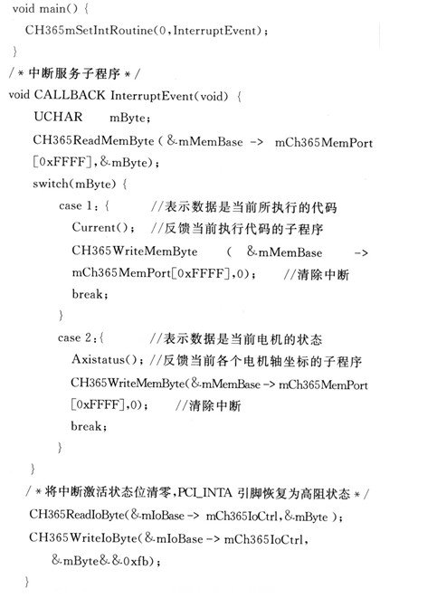 數(shù)據(jù)反饋功能主要是通過(guò)CH365響應(yīng)DSP中斷來(lái)實(shí)現(xiàn)的。DSP程序?qū)?shù)據(jù)寫(xiě)入雙口RAM低4 KB空間后向CH365申請(qǐng)中斷,CH365響應(yīng)中斷將數(shù)據(jù)反饋到PC并顯示人機(jī)界面。中斷函數(shù)部分代碼如下: