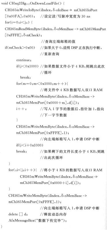 由上述可知,雙口RAM的高4 KB空間用于PC機(jī)向DSP下載數(shù)據(jù),如果數(shù)據(jù)大于4 KB,則存在著一次不能夠把全部數(shù)據(jù)下載到DSP中的問(wèn)題。因此,采取了向雙口RAM中循環(huán)寫(xiě)入數(shù)據(jù)的辦法,即PC機(jī)向雙口RAM一次只寫(xiě)入4 KB數(shù)據(jù),接著向DSP申請(qǐng)中斷。DSP響應(yīng)中斷一次性將4 KB數(shù)據(jù)復(fù)制到DSP其他大容量存儲(chǔ)空間(如擴(kuò)展SRAM)中,然后釋放雙口RAM空間。此時(shí)PC機(jī)便可再寫(xiě)入4 KB數(shù)據(jù),如此循環(huán)往復(fù),直到將所有數(shù)據(jù)都寫(xiě)入DSP中。部分代碼如下: