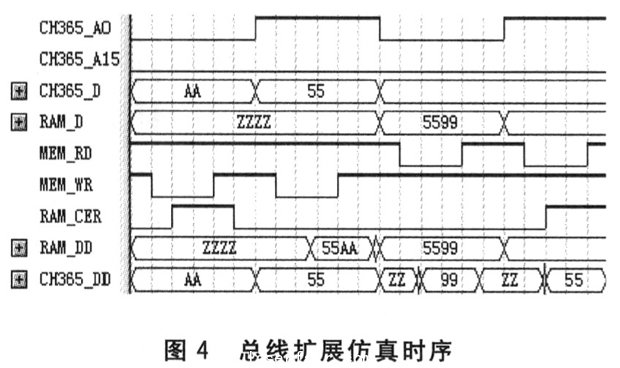 對(duì)上述邏輯關(guān)系用“MAX+PLUS”進(jìn)行仿真后,得到圖4所示的時(shí)序。圖中RAM_DD和CH365_DD表示仿真結(jié)果,從圖中可知仿真結(jié)果完全符合設(shè)計(jì)要求。