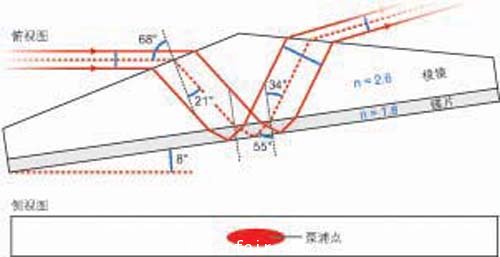 研究人員使用SiC棱鏡代替平面SiC窗口,以某一角度泵浦棱鏡/碟片復合塊,并設計棱鏡使得光束以布儒斯特角入射到復合塊的界面上(除單次全內反射外),這意味著對p偏振的800nm泵浦光而言,所有的損耗都為零(見圖),從而解決了使用SiC所帶來的光損耗問題。棱鏡兩端的距離為40mm,頂端到底面的厚度為8.3mm;增益介質的厚度為0.4mm。激光碟片只通過SiC棱鏡冷卻,碟片的其他面保持與空氣接觸,這樣就可以通過熱成像儀測量SiC的溫度分布。