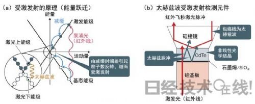 日本東北大學(xué)尾辻研究室證實(shí)的、石墨烯受激發(fā)射出太赫茲波的原理(a),以及評(píng)測(cè)用元件的構(gòu)造(b)。(a)為4能級(jí)系統(tǒng)的受激發(fā)射。(b )CdTe起非線性光學(xué)結(jié)晶作用。本圖由《日經(jīng)電子》根據(jù)尾辻研究室的資料制成。