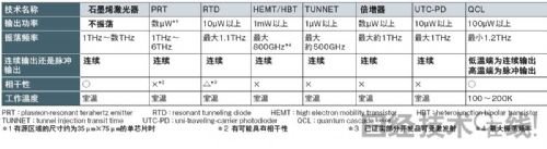 太赫茲波是指頻率在100G~10THz范圍內(nèi)的電磁波。通過(guò)利用太赫茲波,除了能夠?qū)崿F(xiàn)數(shù)據(jù)傳輸速度為100Gbit/秒的超高速無(wú)線數(shù)據(jù)傳輸,以及透視信封鑒定內(nèi)裝藥物的安全用途之外,還有望實(shí)現(xiàn)識(shí)別癌細(xì)胞等醫(yī)療應(yīng)用。瞄準(zhǔn)這些應(yīng)用,業(yè)內(nèi)還積極利用多項(xiàng)關(guān)鍵技術(shù)對(duì)太赫茲波源展開(kāi)了開(kāi)展(表1)。