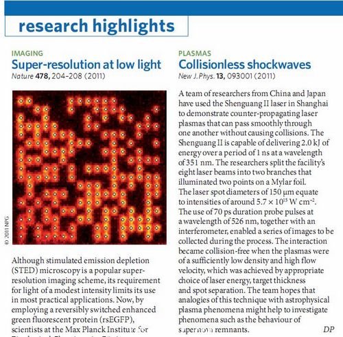 近日獲悉,由中、日、韓三方八個研究單位組成的聯(lián)合實(shí)驗(yàn)小組在神光Ⅱ裝置上進(jìn)行的無碰撞沖擊波實(shí)驗(yàn)物理成果在New Journal of Physics(X Liu et al 2011 New J. Phys. 13 093001)上發(fā)表后,被Nature Photonics(David Pile. 2011 Nature Photonics 5, 644,該刊影響因子為26.508)在Research Highlights中重點(diǎn)推介。該報道以Collisionless shockwaves為標(biāo)題,稱研究小組使用上海神光Ⅱ激光裝置演示相向傳播但可以無碰撞自由相互穿行的實(shí)驗(yàn)。