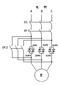 利用晶閘管的開關(guān)特性,通過晶閘管的觸發(fā)角來改變晶閘管的導(dǎo)通時間,從而控制到晶閘管電機端的輸出電壓,達到控制電機的起動特性。當(dāng)晶閘管的電機端電壓和輸入端相同的時候即電機起動過程完畢后,就讓交流接觸器(或斷路器)吸合(如圖1所示意,即QF2吸合),短路所有的晶閘管,這時電動機將直接連到電網(wǎng)上。