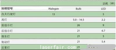 圖1:歐寶Signum汽車的頭燈全部采用了LED解決方案,其用不同的模塊實(shí)現(xiàn)不同的信號(hào)功能:6組LED用于近光燈;底部3組LED用于遠(yuǎn)光燈;邊上兩組小LED用于地角燈;10組LED用作日間行駛燈。方向指標(biāo)燈由位于頭燈頂部的具有反射系統(tǒng)的3組LED組成。根據(jù)各個(gè)信號(hào)燈的不同用途,分別選用不同的LED。