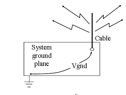 能夠輻射到系統(tǒng)外的輻射被認(rèn)為是EMI,這可能使設(shè)計(jì)無(wú)法通過(guò)FCC認(rèn)證。有兩種可能的輻射:一種是發(fā)射源是一條直線型的信號(hào)印制線,或者電纜的共模輻射,另一種是其信號(hào)和回路構(gòu)成一個(gè)大電流環(huán)路的差分模式輻射。共模輻射隨著頻率的升高而降低,而差分模式輻射則隨著頻率的升高而增強(qiáng),直到其飽和點(diǎn)。這兩種模式的輻射如圖8和9所示。