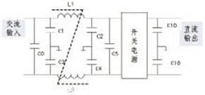 圖中濾波電容C1、C2、C3、C4與電感L1、L2組成共模л型濾波環(huán)節(jié),用來(lái)濾除共模干擾。C0、C5是高頻旁路電容,與電感L1、L2組成差模л型濾波環(huán)節(jié),用來(lái)濾除差模干擾。