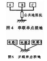 消除公共阻抗耦合的途徑有兩個(gè),一個(gè)是減小公共地線部分的阻抗,這樣公共地線上的電壓也隨之減小,從而控制公共阻抗耦合。另一個(gè)方法是通過(guò)適當(dāng)?shù)慕拥胤绞奖苊馊菀紫嗷ジ蓴_的電路共用地線,一般要避免強(qiáng)電電路與弱電電路共用地線,數(shù)字電路與模擬電路共用地線等。并聯(lián)接地的缺點(diǎn)是接地的導(dǎo)線過(guò)多。因此在實(shí)際中,沒(méi)有必要所有電路都并聯(lián)單點(diǎn)接地,對(duì)于相互干擾較少的電路,可以采用串聯(lián)單點(diǎn)接地。例如,可以將電路按照強(qiáng)信號(hào),弱信號(hào),模擬信號(hào),數(shù)字信號(hào)等分類,然后在同類電路內(nèi)部用串聯(lián)單點(diǎn)接地,如圖4所示,不同類型的電路采用并聯(lián)單點(diǎn)接地,如圖5所示。當(dāng)信號(hào)頻率低于1 MHz時(shí)可采用單點(diǎn)接地的方法,使其不形成回路。信號(hào)頻率高于10 MHz時(shí)最好采用多點(diǎn)接地,盡量降低地線阻抗。電源線與地線應(yīng)盡量靠近走線以減少所包圍的環(huán)路面積,從而減少外界磁場(chǎng)對(duì)環(huán)路切割產(chǎn)生的電場(chǎng)干擾,同時(shí)也減少環(huán)路對(duì)外電磁輻射。