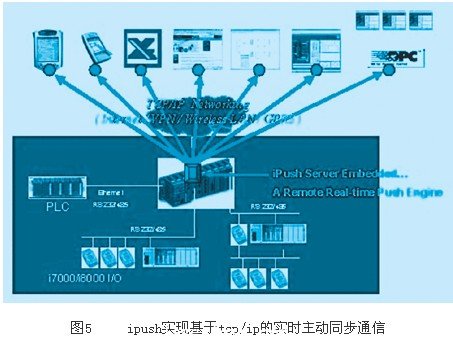 (6)網(wǎng)絡(luò)聯(lián)機(jī)ipush:此功能打開(kāi)一扇網(wǎng)絡(luò)方便門(mén),使得應(yīng)用系統(tǒng)使用者不用知道背后復(fù)雜的網(wǎng)絡(luò)處理程序。以往如果設(shè)計(jì)網(wǎng)絡(luò)系統(tǒng),就必須知道tcp/ip、socket、網(wǎng)絡(luò)通信協(xié)議7層架構(gòu)等技術(shù)知識(shí),然后設(shè)計(jì)網(wǎng)絡(luò)通信程序,又要考慮通信量、通信速度、socket api使用、通信timing的掌握等高級(jí)的程序設(shè)計(jì)技巧。同時(shí)通信的形式又有多種選擇,例如:短信、語(yǔ)音通知、影像傳輸、e-mail、message、主動(dòng)廣播、多數(shù)或單獨(dú)通知、通信頻率、單向或雙向通信等不同方式。最后接收端的選擇也是多樣性,例如:監(jiān)控系統(tǒng)、opc server、excel、pda、手機(jī)、internet瀏覽器等。如今以上的一切都交給ipush就可以了,如圖5所示: