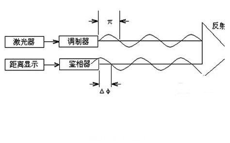 相位式激光測距儀是用無線電波段的頻率,對(duì)激光束進(jìn)行幅度調(diào)制并測定調(diào)制光往返測線一次所產(chǎn)生的相位延遲,再根據(jù)調(diào)制光的波長,換算此相位延遲所代表的距離。即用間接方法測定出光經(jīng)往返測線所需的時(shí)間,如下圖所示。