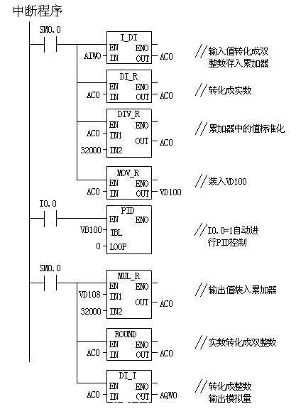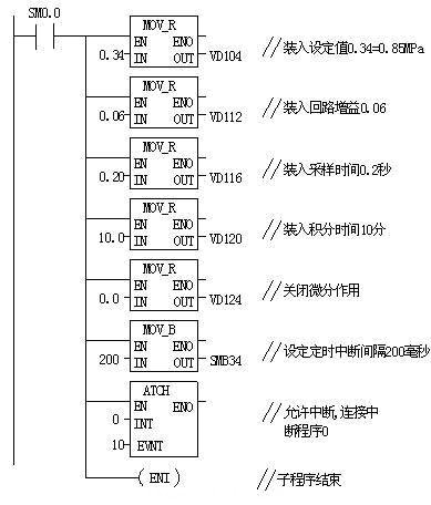過程變量值是壓力變送器檢測的單極性模擬量,回路輸出值也是一個單極性模擬量用來控制鼓風機的速度。這兩個模擬量的范圍是 0.0 -1.0 ,分辨率為1/32000 (標準化)??梢猿醪酱_定Kc=0.06,Ts=0.2,Ti=10.0,在這里不用微分作用,程序編輯如下圖。
